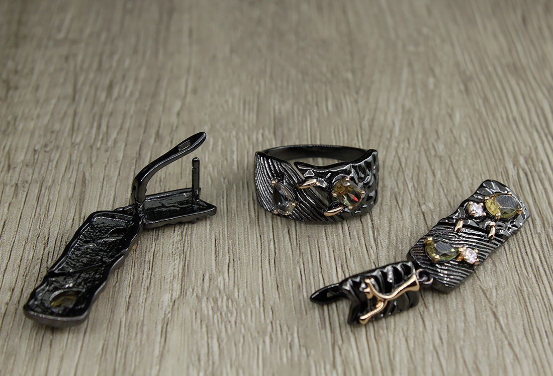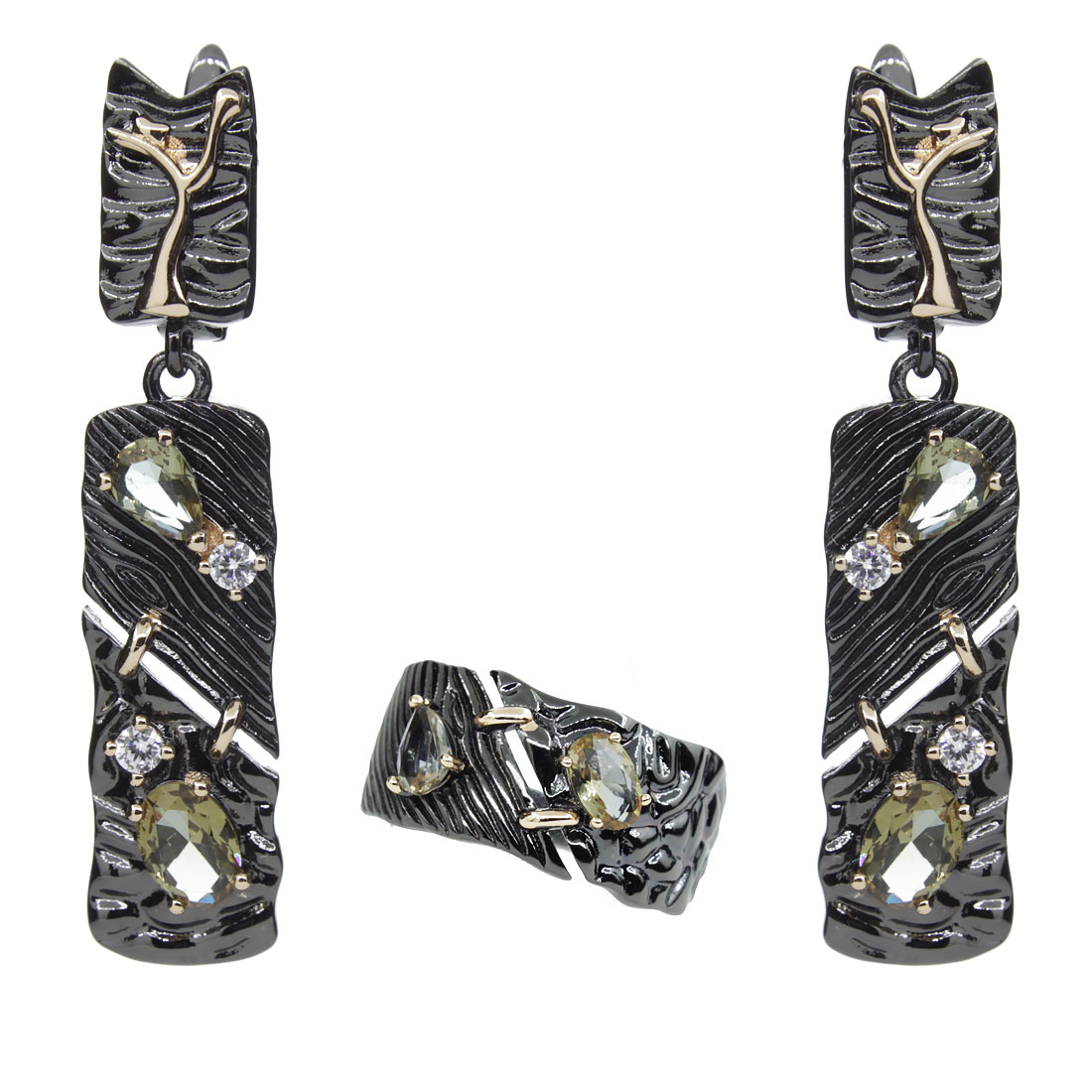Стильный комплект с султанитом и качественным покрытием. Размер камня в серьге: 3,5х5,5мм, размер серьги с застежкой: 47.5мм. Размер камня в кольце: 4х6мм.Ширина кольца 10мм